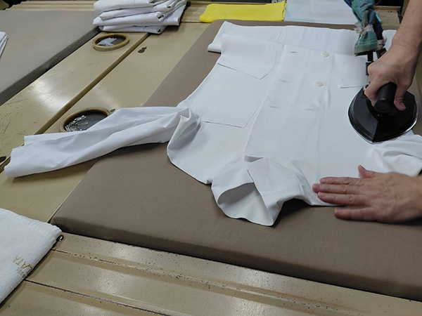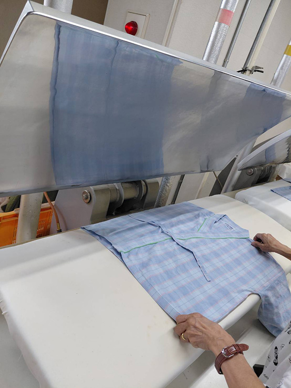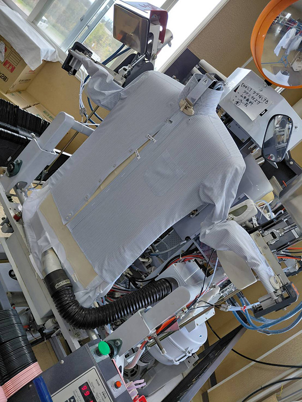 ・ワイシャツはワイシャツ専用機械で仕上げ、仕上がったワイシャツのボタンを留めて梱包します